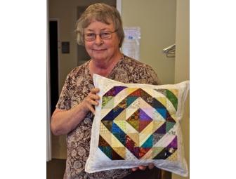 A quilted 16" pillow sham created by quilter Judy Keim expressly for Chocolate Fest English Tea!