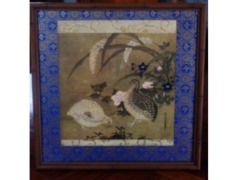 A beautiful framed print of partridges and peonies - 17" x17" - cherished for over 40 years by the donor, who hung this in her office.