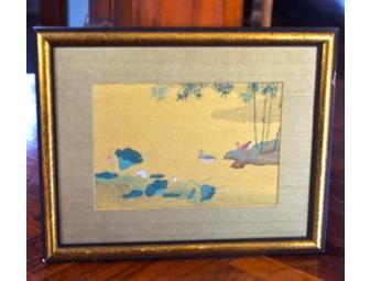 Golden silk painted with ducks, bamboos, and water lilies. The donor enjoyed this as an evocation of peace in her office for many decades, and now entrusts it to you. 12.5" x 15.5"
