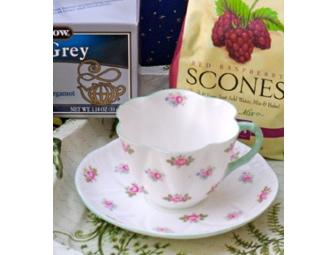 Tea pot, Boyds cup and saucer with beaded teaspoon, Mrs. Beeton's Victorian Alphabet Every Day Recipe Book, scone mix and raspberry jam, and a selection of British teas.