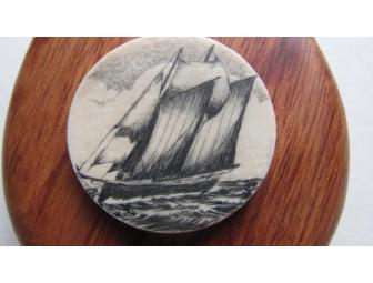 Mary Ellen Sullivan of Salem Mass was taught the art of scrimshaw decades ago by her friend and mentor Tom DeMont, a native of Martha's Vineyard Island and owner of Edgartown Scrimshaw Gallery until his death in December of 2011. Every piece of scrimshaw she etches is fondly dedicated to his memory.