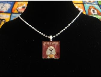 Handmade from hand cut, kiln fired glass. This coffee company Cocker Spaniel pendant measures 1x1 inch and has a heart shaped bail attached on back. It has been sealed twice and is water resistant, but not completely waterproof, so please remove before swimming or showering. This pendant is shown with a 24 inch ball chain necklace, but the winner can choose from other options if he/she wishes. Click the photo to enlarge!
