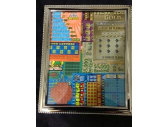 This is an 8 x 10 pretty silvertone frame filled with $30 worth of NY State Lottery scratch-off tickets. They range from $1-$5 tickets. How much can you win? A TON!!! This frame and lotto tickets are priceless!!!! Each ticket gives you a few chances to win..Feeling Lucky???