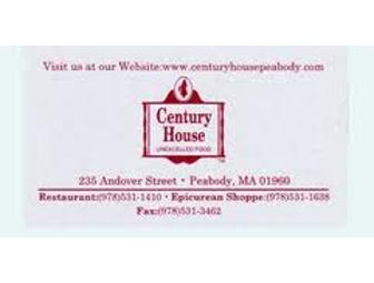 $75 gift certificate to the Century House Restaurant in Peabody. May also be used in the Epicurean Shoppe.