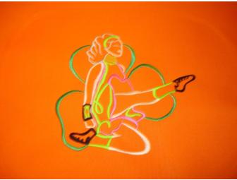 Perfect for travel, this compact and lightweight bag has a thin 2" sturdy plactic siding all the way around the bag, encased in nylon fabric to make the sides stiff and keep its shape. The lining inside seperates your dresses to protect your dress embroidery and crystals. Two dowel rods slide into pockets on each side so that the rod won't slip out and the dress is better protected. At least two dresses can be held in the bag. The bag has a shoulder strap and a small handle on top of the bag for easy carrying. The zipper opening goes fully from one side to the other, making it easier to put your dress in the bag. The bag comes with the shown Irish Dancer embroidery. This medium sized dress bag measures 24" across the top, 24" top to bottom, 36" at the widest, and 2" deep. It is a great Neon Orange color and will be personalized with your dancer's name.