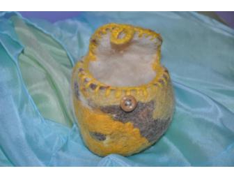 This soft, multicolored Felted Box can hold all kinds of different toys. It has a lid with a button to keep it shut.