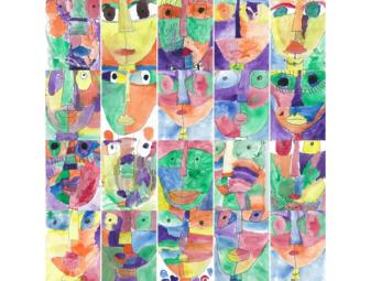 A collage of 1st Grade Picasso-inspired portraits in acrylic print. Dimensions: 24" H x 36" W