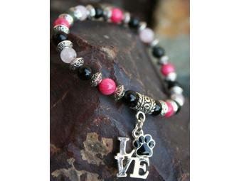 This lovely piece is created using obsidian and rose quartz (lighter pink beads). This piece is worn as a symbol of your affection and love for the wonderful furry friends in your life. The second photo (with a pink paw print) is the actual bracelet the winner will receive.