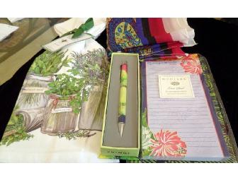 This beautiful array of items makes a great housewarming gift! Include are two cotton kitchen towels, a lovely fringe pen (in box), a Mudlark list pad of 80 decorative sheets with magnets (perfect for the fridge), and a gorgeous colorful scarf.