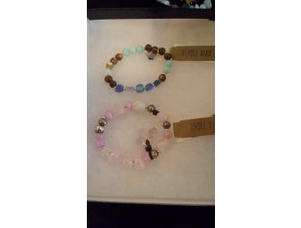 This bracelet duo is perfect for the working woman! One bracelet features pink quartz and amethyst beading while the other bracelet features blue and brown stonemix with silver metal.