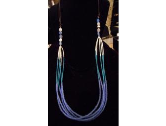 This beautiful ombre necklace features blue beads with silver and natural gemstones. It measures 30" long.