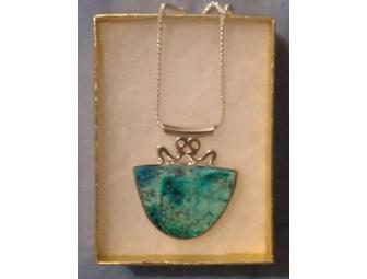 This beautiful Chrysocolla pendant was hand cut and polished by Gary Chappell, then set in a handcrafted solid sterling silver setting. This one of kind piece is numbers and signed, and will make a beautiful addition to your jewelry collection.