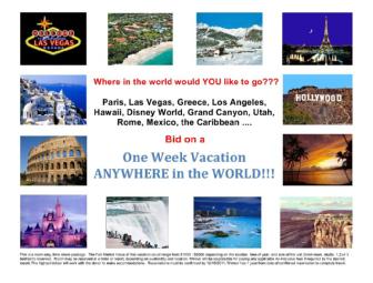 Enjoy a one-week time share vacation anywhere in the world! This time share package entitles the winning bidder to choose a one-week vacation at the destination of choice. Time share fees up to $450 will be paid by the donor. If location chosen requires fees above $450, these are to be paid by the winning bidder. Vacation may be reserved at a hotel, condo or resort depending on location and availability.