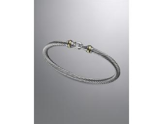 This dazzling, David Yuman signature, “cable” bracelet is made of sterling silver and 18-karat yellow gold. Comes with a 4mm cable with buckle clasp. Fits standard medium wrist.