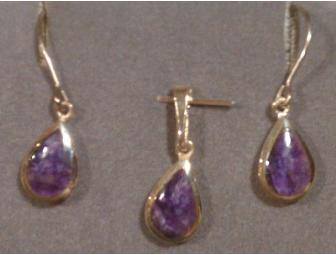 Add these beautiful handcrafted earrings and pendant to your jewelry collection! Sterling Silver and Charoite earrings and pendant are teardrop-shaped, and the earrings feature titanium ear wires.