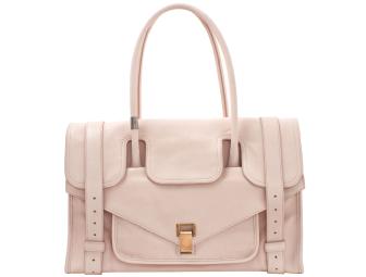 The bag has metal tab closure, a front pocket, leather straps, and leather handles. The interior is lined with a logo jacquard. One interior compartment contains a leather trimmed inner zip pocket and two leather inner pouch pockets. The exterior includes a metal cuff with the Proenza Schouler logo on the front handle.