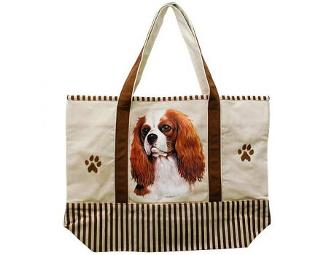 Attractive and roomy, this trendy cotton canvas tote is the perfect accessory for every girl about town. Natural color background; brown striped trim and bottom section. Tote's front is screenprinted with two paw prints and breed illustration by artist David Wenzel. 7 in wide flat bottom for lots of space. Striped tote bag measures 15 x 20 x 7 inches.