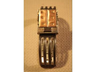 This unisex wrist watch was specifically created for the PS 84 Spring Gala Benefit Auction by Brooklyn based watchmaker José Paternoster. The hinged copper plates open to reveal the painted face of the watch. Kaisa and Paternoster Designs offer a unique collection of one-of-a-kind handcrafted watches and jewelry. The main mediums used are copper, sterling silver, and brass.