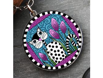 Vibrant, necklace features a colorful Cat on the front. On the back is an image of a black Kitty with the words Love thy Kitty! Artwork from artist Spirit Anderson. Made in the USA