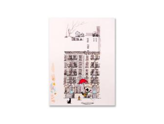 Check out Castillo's delightful depiction of a rainy day in New York City -- tenements, water towers and a bright red joyful umbrella. Swoon. (Measures 5.5" x 11.5".) Castillo is the illustrator of Spunky Tells All, which just won the Beverly Cleary Children's Choice Award; The Reader, The Pig and Miss Prudence, What Happens on Wednesdays and many more.