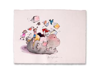 Fun, funny piece from The Wonderful Thing About Hiccups. For book-lovers, kids, hippo fans and Converse hightop devotees. Don't you think this looks a wee bit like a color-happy Quentin Blake work? (Measures approximately 10" x 11".) Thanks, Janet Pedersen!