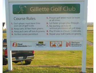 An 18-hole round of golf for four with carts at Gillette Golf Club in Gillette, WY. Normal golf attire. Certificate expires one year from the date of purchase. www.worldgolf.com.