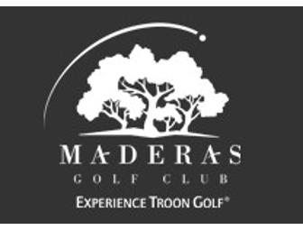 An 18-hole round of golf for four players (a foursome) with golf carts at the Maderas Golf Club in Poway, CA. Golf appropriate attire is required. Black out dates include Nov. 18 and Dec. 24-31. Valid Monday-Thursday excludes holidays. Tee times must be made 3 days in advance. Contact Bill O'Brien, General Manager, to arrange tee times. Certificate expires Dec. 31, 2013. Visit maderasgolf.com.