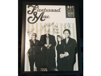 Framed autographed tour poster signed by Fleetwood Mac included signatures from Stevie Nicks, Lindsey Buckingham, John McVie and Mick Fleetwood. Print is from the 2013 concert at the BOK Center. Package also includes tour t-shirt and color poster of the band.