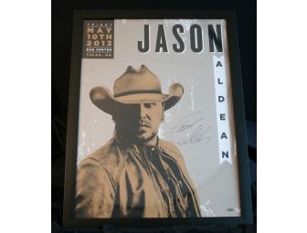 Framed autographed tour poster signed by Jason Aldean. Print is from the 2013 concert at the BOK Center. Package also includes tour t-shirt.