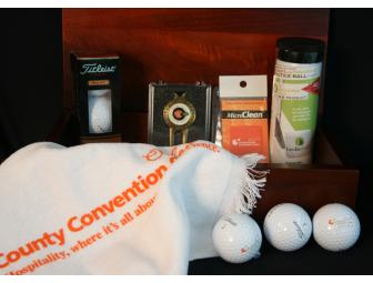 Wooden golf box includes a sleeve of golf balls and practice balls, divot tool, pen, glass cleaner and micro cloth.