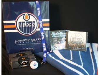 Golf Package includes: two (2) sleeves of Callaway golf balls, Oilers fleece blanket, Oilers history book, lanyard, two (2) pins and two (2) CD's.
