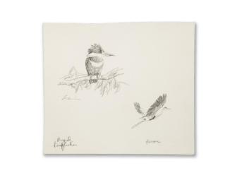 This expressive 9" x 8" pencil-and-paper illustration depicts a ringed kingfisher perched on a branch and a heron in eloquent flight. It's from Tooth & Claw: Animal Adventures in the Wild -- the true story, told in text, photos and illustrations -- of Ted Lewin's travels and creature-related escapades all over the world. Ted is the illustrator of over 100 children's books; he won a Caldecott Honor in 1994, and (fun fact!) he and his two brothers and sister all have been professional wrestlers. Ted and his wife Betsy Lewin have been the subjects of retrospectives at the Brooklyn Public Library, The Society of Illustrators gallery, The Children's Museum of Manhattan and the Pratt Institute.