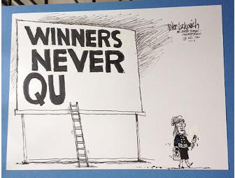 This Mike Luckovich original ink on bristol (with cartoonist's White-Out emphasis) measures 9" high by 12" wide. It depicts Sarah Palin walking away from a billboard that reads, "WINNERS NEVER QU" with a brush and paint can. It was published July 7, 2009 by the The Atlanta Journal-Constitution and syndicated throughout the nation.