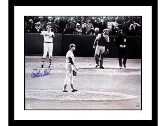 Relive the moment in the 12th inning of Game 6 of the 1975 World Series when Carlton Fisk hits a game winning home run. In what some say is the greatest World Series ever, Fisk waving his hands pleading for his home run to stay fair and then finally, it hit off the foul pole and is just one more great moment for baseball fans. This 16x20 photograph is professionally framed in a black hard wood frame with double matte and is hand signed in a blue sharpie. Certificate of Authenticity Included.