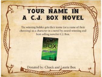 The winning bidder gets their name (or a name of their choosing) as a character in a novel by award-winning and best-selling novelist C.J. Box.