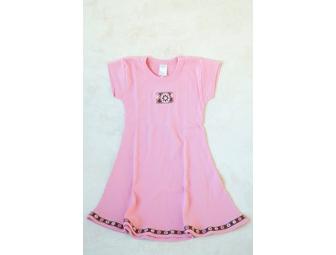 Girls pink cotton dress with ribbon trim and cap sleeves.