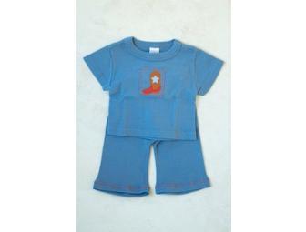Boy's light blue cotton pant and top set with short sleeves and leather cowboy boot applique.