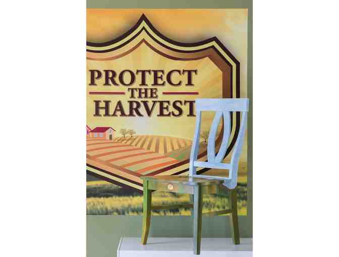 The beautifully painted chair resembles the “Preserve the Harvest” logo. The chair is made out of solid oak. The artist used gesso to coat the entire chair, oil paint, and several coats of Varmar varnish to protect the oil paint from wear. The painting on the chair is magnificent and includes many different colors that would look great in any room of your house!