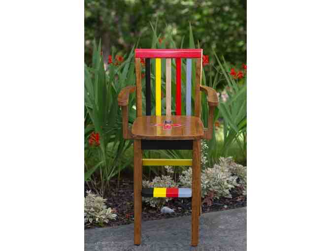 Calling all Indianapolis Indians Fans! This chair is made out of solid oak and has been painted with a golden oak stain, acrylic paint, and it has a polycrylic protective finish. The size of this chair is great to use as a highchair for a toddler. Whether you are looking for something to add character to your child’s play room or bedroom, this chair is perfect!