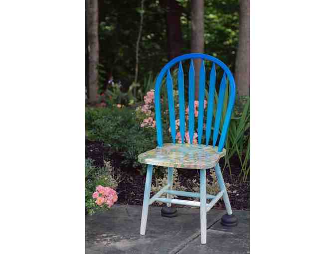 Do you enjoy traveling? This chair features a 1940’s world atlas that has been put on the seat of the chair. The chair is made out of solid oak and has been painted with acrylic paint, resin, and polyurethane. This chair would look great featured in an office or living room.