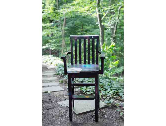 Isn’t the outer space interesting? This youth chair reflects outer space. The chair is made out of solid oak and it has been painted with gesso, spray paint, acrylic paint, and gloss. The colors are vibrant against the black background of this chair. This chair is perfect for any toddler to use as a high chair. They will enjoy sitting in this fun outer space chair!