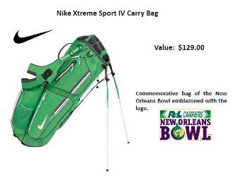 Commemorative bag of the New Orleans Bowl emblazoned with the logo. Play distraction-free with the Nike Xtreme Sport IV Carry Bag. Comfort, convenience, and functionality makes this bag a must-have on the course so that all you have to worry about is that four-putt for birdie. Additional features: 9" oval top, eight-way, three full-length dividers, nine functional pockets (six zippered), Nike revolving double-strap system, ventilated air mesh hip pad, lightweight and durable construction and integrated tee and range finder/gps loop.