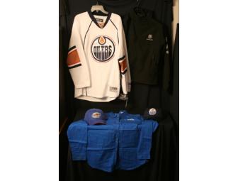 Package includes: Northlands Oxford shirt (XL men's), Northlands Canadian finals rodeo jacket (Medium women's), Edmonton Oilers jersey signed by Theo Peckham, Oilers hat signed by Ben Eager, and Edmonton Oil Kings hat.