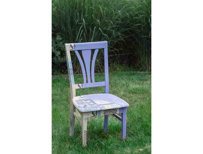This chair is made out of solid oak and was painted with pastel color spray paint. It was designed to highlight the Peace Learning Center’s work in the community. It incorporates the Peace Learning Center dove as the main design element and features a calming color palette.