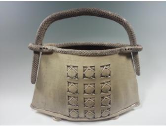 This beautiful, one-of-a-kind pottery piece is named 'Maryam's Basket' in honor of the artist's grandmother. It can be used for display or as a dramatic vase. The dimensions are 16"x13"x5.5". It is hand built of porcelaineous stoneware. The exterior is impressed wth texture and washed with stains and fluxes to give it a sheen. No glaze is used on the exterior to accentuate texture. The handle and trim are textured to appear as rope.