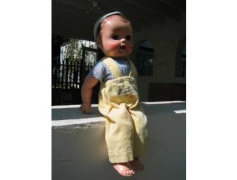 This 17" Ricky, Jr. is in very good played-with condition, and is from a non-smoking home. His outfit of yellow corduroy overalls with name embroidery on the front, matching hat and striped shirt is all original, but his socks and shoes are missing. He is wearing new socks/booties (not shown).