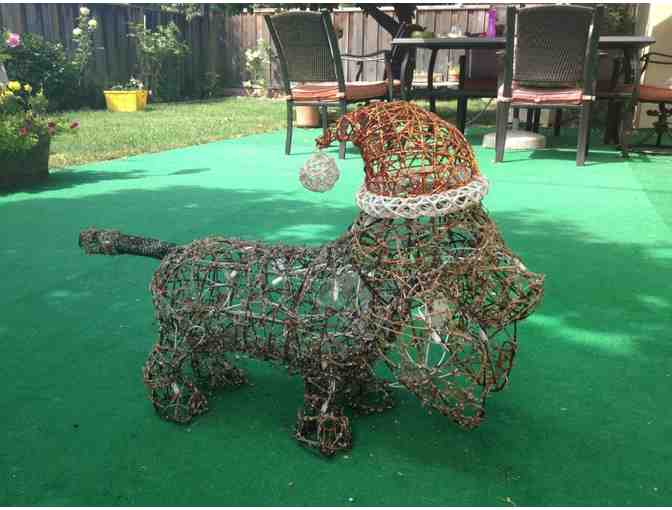 Adorable basset hound frosted skeleton with a few lights interspersed through it, sporting a beautiful red and white santa hat to cheer the Holiday season for you.