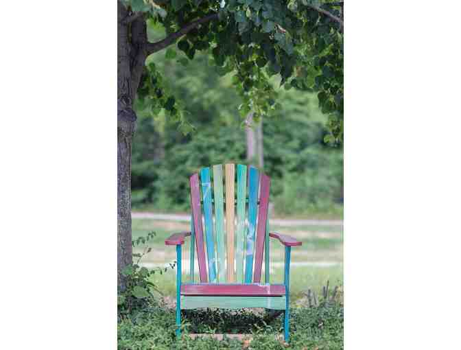 This Adirondack chair is made out of Acacia Wood and has been painted with acrylic paint and acrylic sealer. This chair has more of an urban feel and has a colorful pallet of a rainbow with scattered numbers painted throughout the chair. Perfect for any outdoor patio.