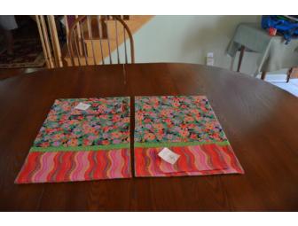 These placemats are handmade by NH quiltmaker Suzanne Connor. Each comes with a mathing napkin. One placemat has a floral napkin, the other has a wave design napkin. The placemats are reversible.