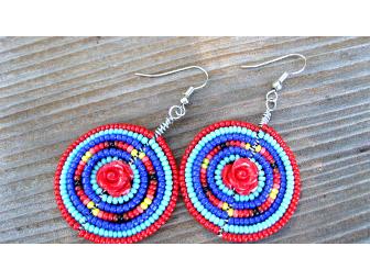 Circular 'mandala' earrings made from a layers of red, turquoise, blue, yellow, coral, and black seed beads, with an acrylic red rose center. Set on stainless steel earwires.